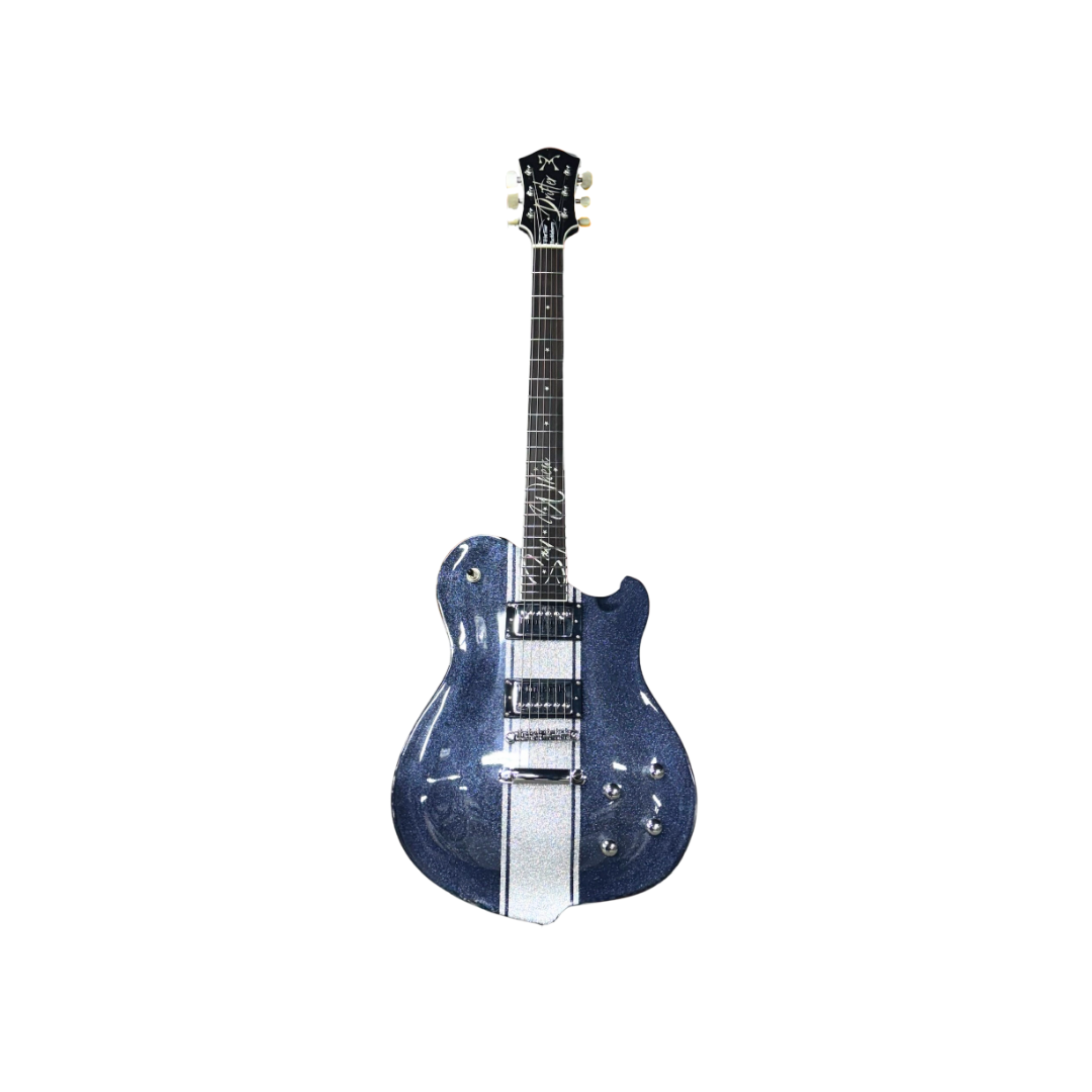 This instrument is painted in a stunning electric sparkle with a sparkle silver racing stripe down the center.