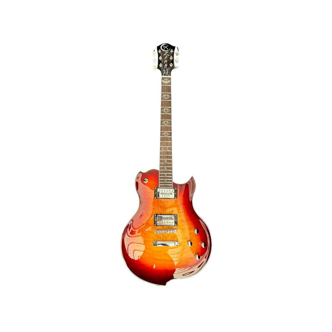 This is the most technically "perfect" single cut-away guitar on the market. The traditional single cut-away guitar is severely lacking in the left-side surface area which is used to grab and articulate low-end frequency response. By incorporating Minarik Guitars proprietary Tone Tail Engineering on the bottom of the body and adding an additional tail on the upper left bout, the frequency problems with the traditional single cut-away guitar have been "corrected.” The cut-away has been sharpened and enhanced to tie in with the two other "points" on the body, giving this guitar that signature Minarik design style.