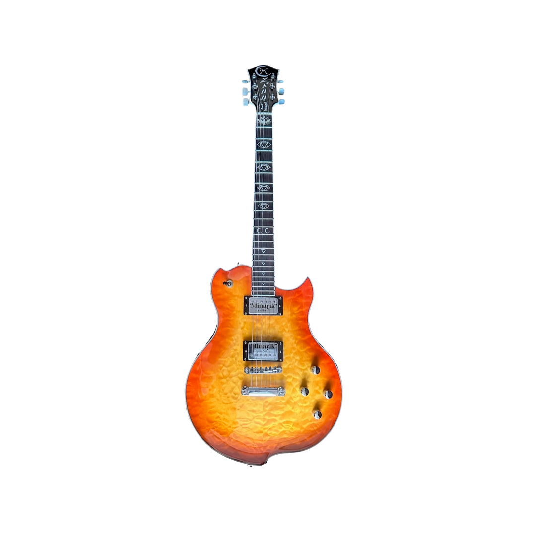 This is the most technically "perfect" single cut-away guitar on the market. The traditional single cut-away guitar is severely lacking in the left-side surface area which is used to grab and articulate low-end frequency response. By incorporating Minarik Guitars proprietary Tone Tail Engineering on the bottom of the body and adding an additional tail on the upper left bout, the frequency problems with the traditional single cut-away guitar have been "corrected.” The cut-away has been sharpened and enhanced to tie in with the two other "points" on the body, giving this guitar that signature Minarik design style.